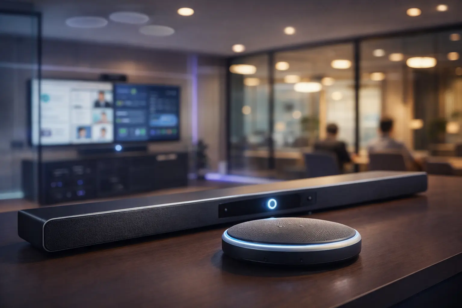 La elección del micrófono depende del tamaño y tipo de sala. Para salas pequeñas (2-6 personas), un micrófono de barra integrado en la cámara es suficiente. Para salas medianas (6-12 personas), se recomiendan micrófonos de mesa como los de Poly, Logitech o Shure. Para salas grandes o de conferencia (+12 personas), lo ideal son micrófonos de techo o sistemas de microfonía distribuida de Biamp, Shure MXA o Sennheiser.