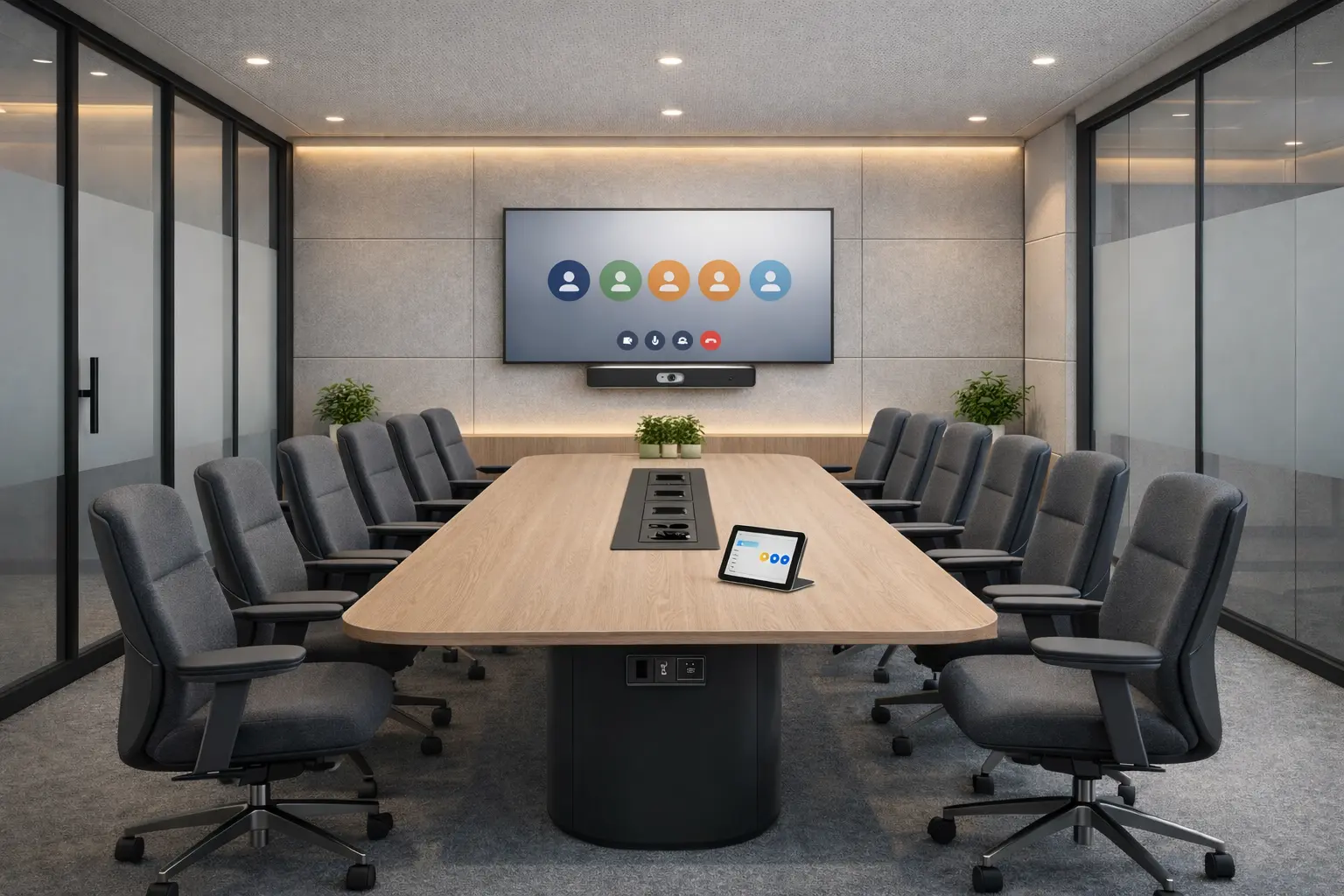 Convertimos salas de 25 a 35 m² en espacios listos para el día a día: doble pantalla (participantes + contenido), cámara HD con zoom óptico, microfonía ampliable y audio optimizado con IA.